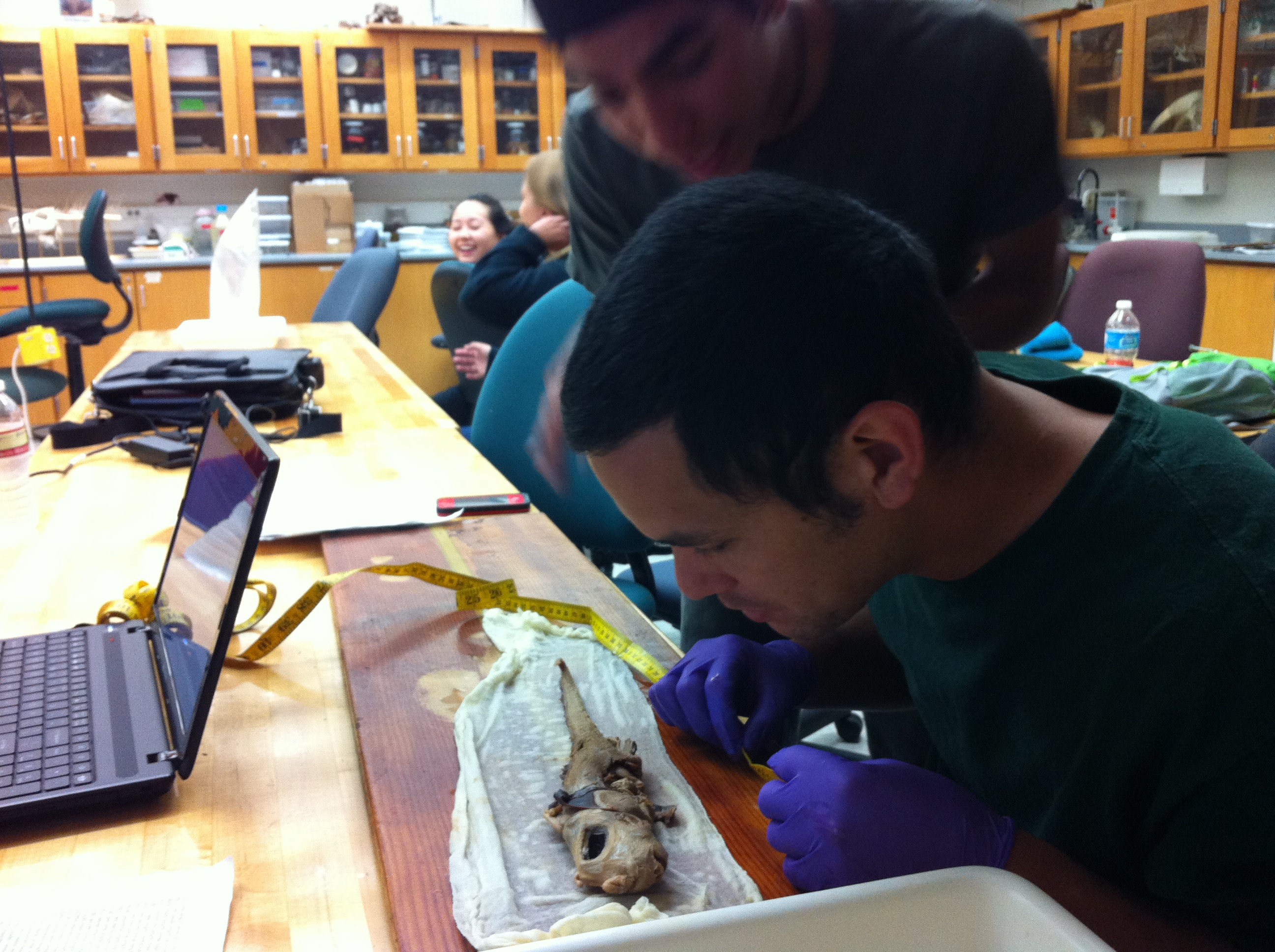 CSUMB undergraduate Matt Jew takes morphometrics on a Hydrolagus macrophthalmus,or bigeye Chimaera, to redescribe the species his CSUMB senior Capstone project.