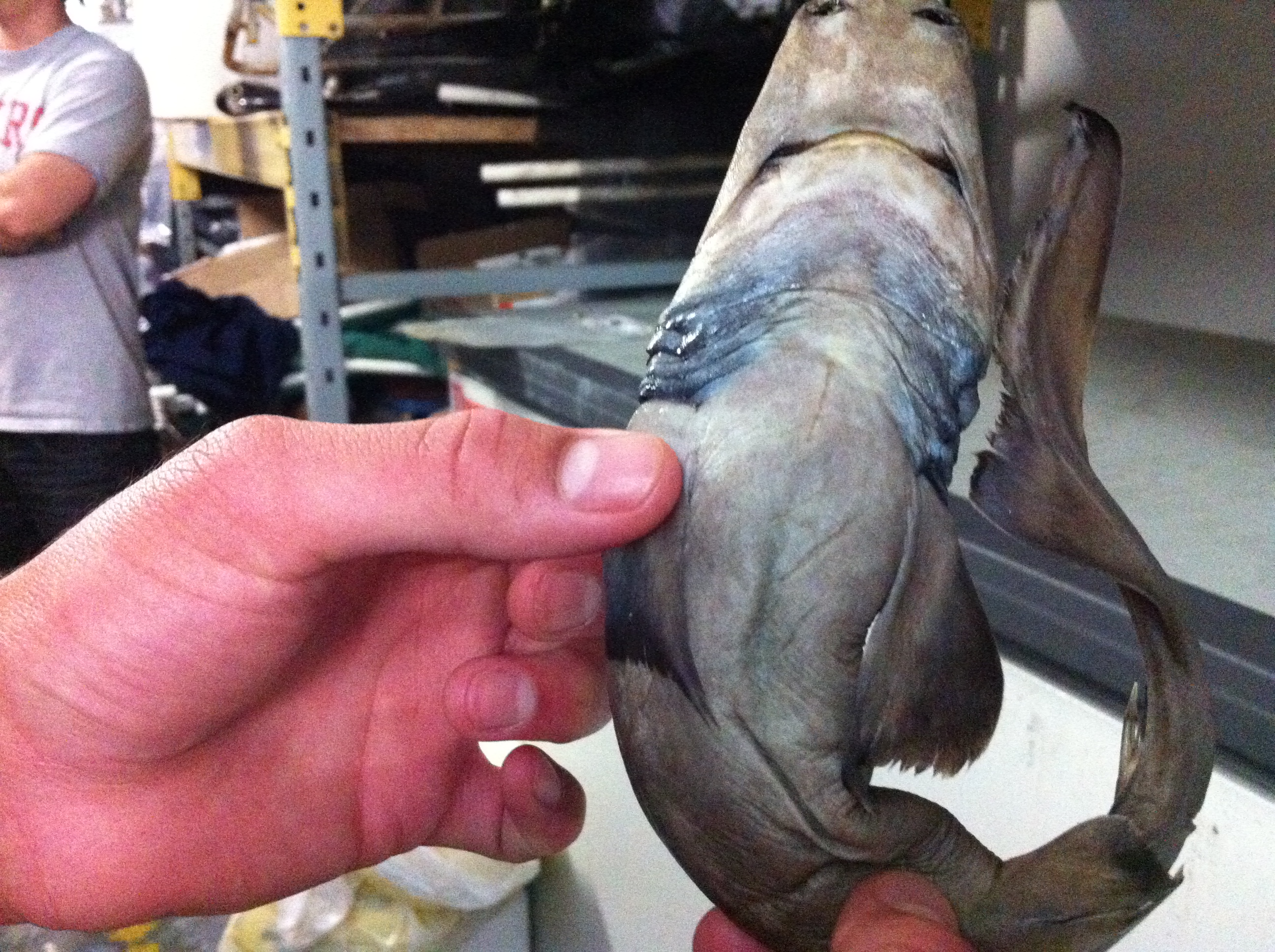 CSUMB undergraduate Matt L. holds a small shark specimen. Notice how anatomical the shark is at such a small size, unlike us mammals who look a bit like tiny aliens during gestation.