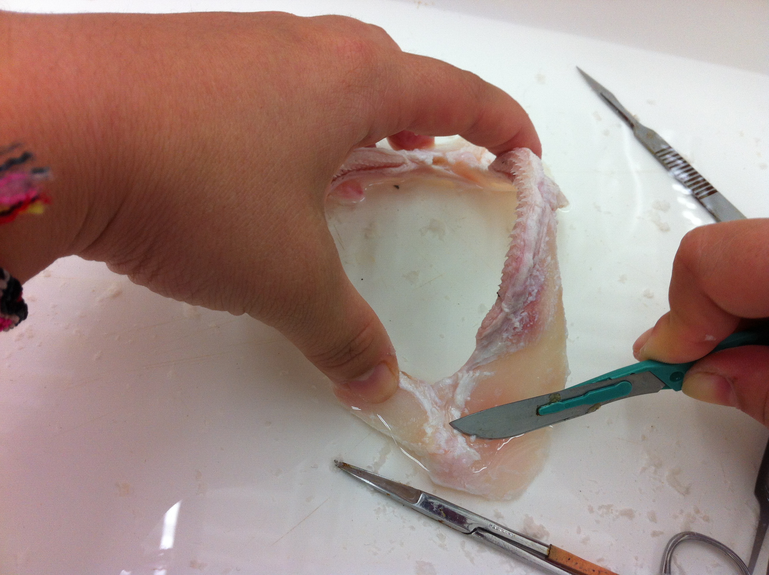 Previous Image Next Image sa_lab_14sept_034 PSRC volunteer Nina scrapes away tissue to skeletonize a shark jaw.