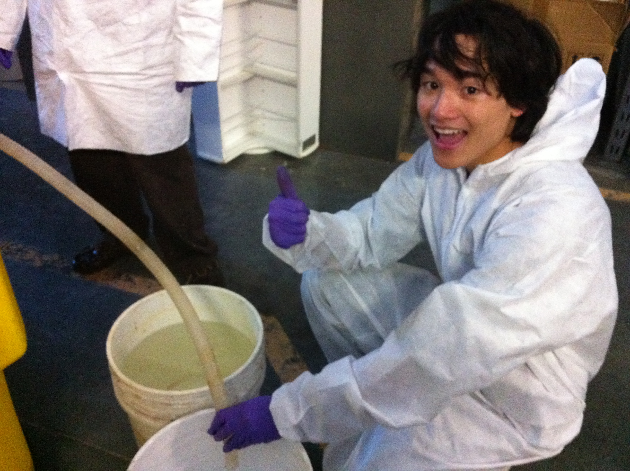 Brian helps Paul ciphon fresh ethanol from a shipping barrel to replace the old, used ethanol that was the storage bin containing shark specimens.