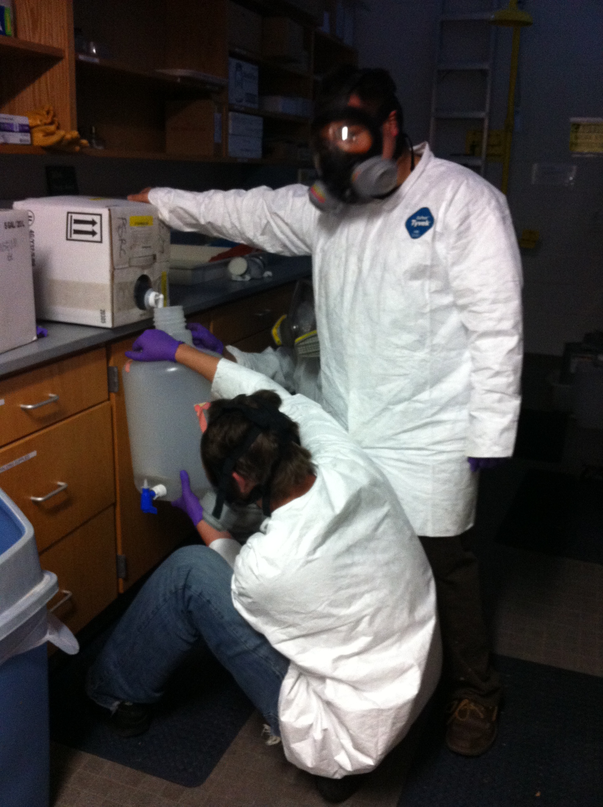 Previous Image Next Image sa_lab_1march2014_33 PSRC interns Justin and Marty gather formalin from a shipping container.