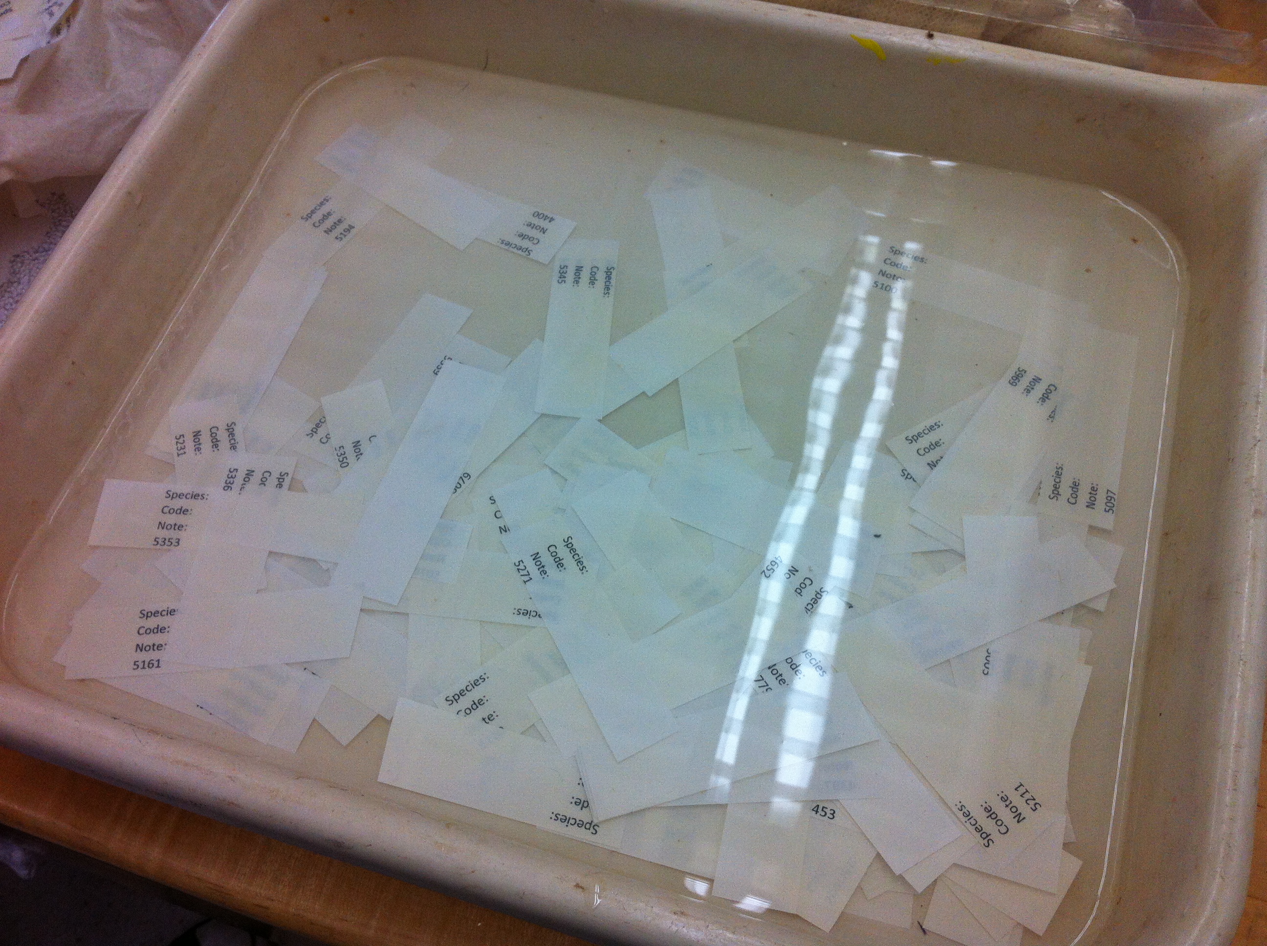 Previous Image Next Image sa_lab_22feb2014_04 CSUMB undergraduates Kayla and Maddy soak old oily and smelly waterproof tags to be reused on Paul’s next trip.
