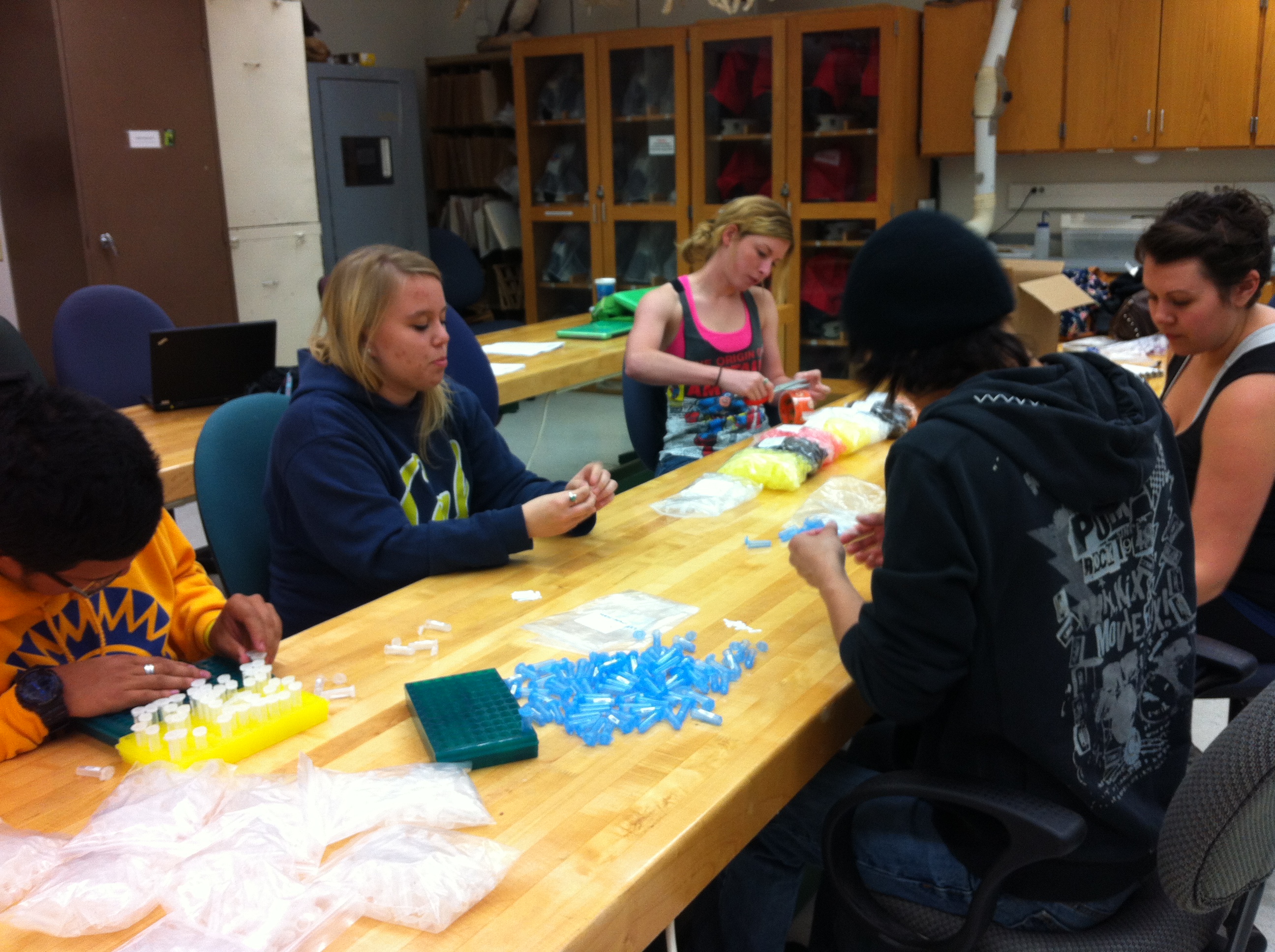 Previous Image Next Image sa_lab_5april14_03 The team work endlessly to prep vials for Paul’s trip and further MLML and Shark Army study