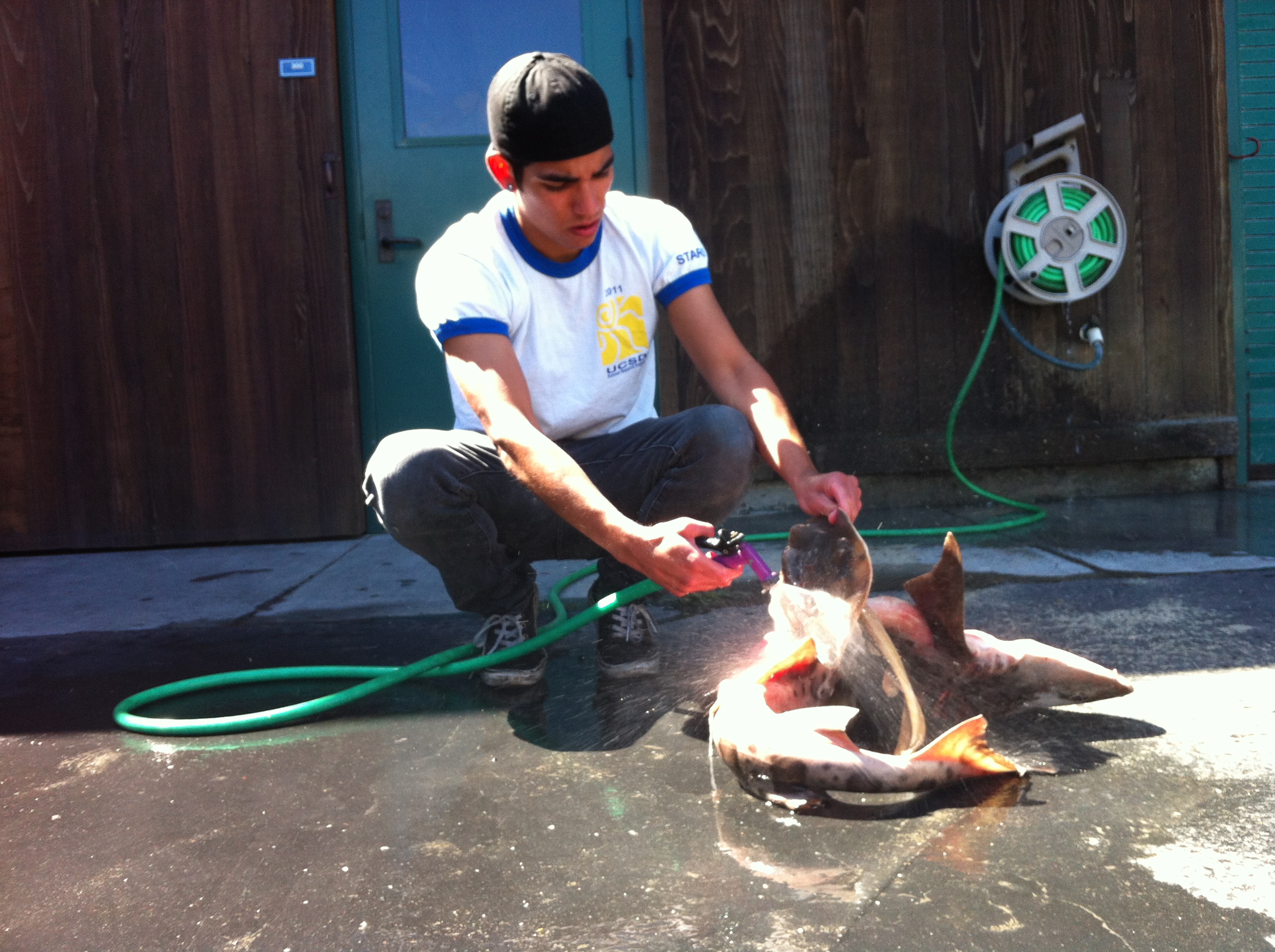 Previous Image Next Image sa_lab_7sept_004 UROC intern Matt Lawson defrosts a leopard shark specimen for further study.