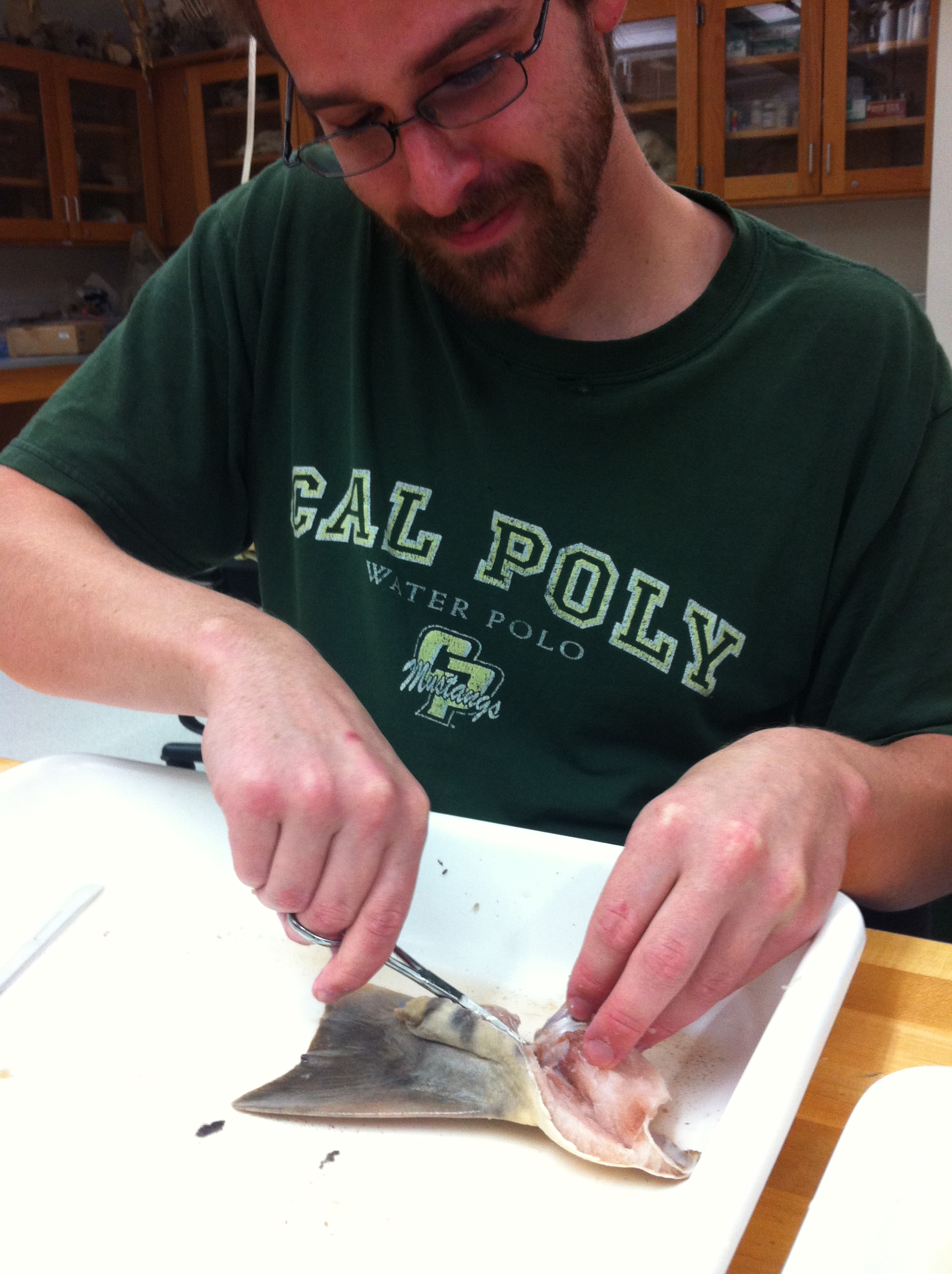Previous Image Next Image sa_lab_8feb2014_04 CSUMB senior Marty carefully scrapes and scratches away tissue off a specimen using a scalpel.