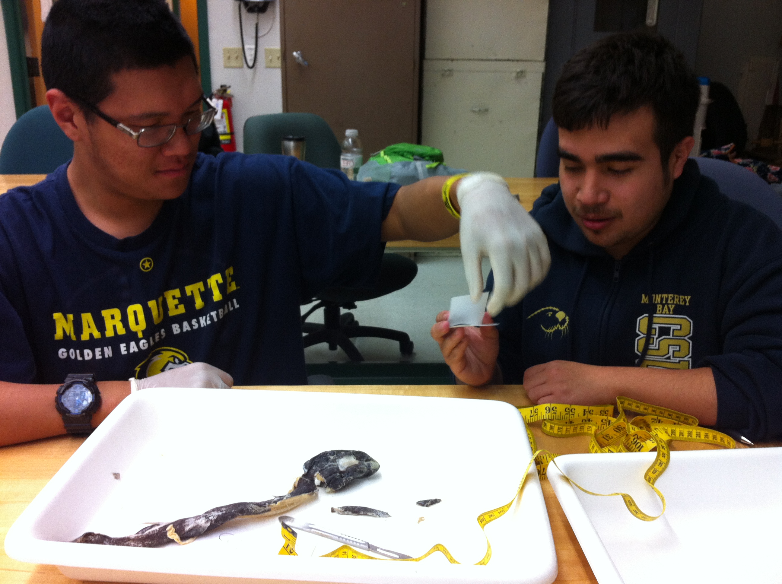 SJSU undergraduate Edward and UROC intern Justin collect data from a Etmopterus granulosus for further study of the species.